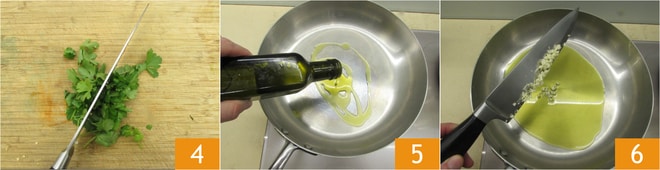 Separe os talos da salsinha e pique as folhas 4. Enquanto isso, em uma frigideira bem larga, adicione 20 g de óleo 5, o alho picado 6 bem fininho.