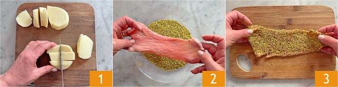Para preparar os espetinhos de rolinhos com pistache, primeiro corte o queijo scamorza em cubos 1. Coloque a farinha de pistache em uma tigela e empane as fatias de vitela 2 dos dois lados. Coloque cada fatia em uma tábua 3.