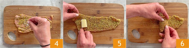 Para esta receita, é melhor usar farinha de pistache e não pistaches triturados, pois a consistência é mais fina e adere melhor à carne. As fatias de vitela devem ser bem finas, se necessário, bata-as com o martelo de carne.