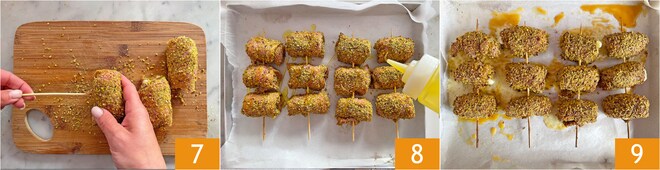 Espete 3 rolinhos de cada vez em cada espetinho de madeira 7. Coloque os espetinhos em uma assadeira forrada com papel manteiga, regue com azeite de oliva e asse em forno ventilado pré-aquecido a 200° por 25 minutos. Quando estiverem cozidos, retire seus espetinhos de rolinhos com pistache do forno e sirva-os quentes e derretidos 9!