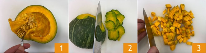 Para preparar o filé de porco com abóbora e figos, comece pela abóbora: retire as sementes, os fios internos 1 e a casca 2. Corte-a em cubos 3.