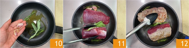 Em uma frigideira, coloque um fio de azeite, acrescente o alecrim, a sálvia e o alho com casca 10. Adicione o filé 11 e doure por 3-4 minutos de cada lado 12.