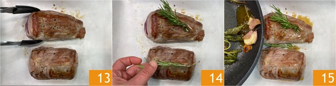 Coloque os filés em uma assadeira forrada com papel manteiga 13, adicione o alecrim 14 e regue com o fundo de cozimento 15. Asse em forno estático a 180°C por 15-20 minutos, até atingir uma temperatura interna da carne de 65°C; você pode usar uma sonda para medir a temperatura interna da carne. Uma vez cozido, deixe descansar por pelo menos 5 minutos.