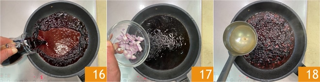 Enquanto isso, em uma frigideira, coloque o Porto 16, acrescente a cebola échalote 17 e o caldo de legumes 18.