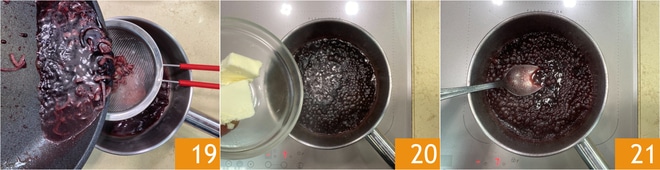 Cozinhe até reduzir o líquido pela metade, depois coe 19 em uma panelinha. Adicione a manteiga 20 e derreta completamente 21. Reserve.