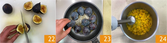 Corte os figos ao meio 22. Em uma frigideira, coloque um fio de azeite, acrescente o mel e posicione os figos com o corte voltado para baixo 23. Cozinhe por 3-4 minutos de cada lado. Com um mixer de imersão, bata a abóbora 24 até obter um purê homogêneo.