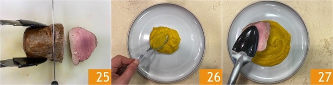 Corte o filé em fatias 25. No fundo do prato, espalhe o purê de abóbora 26, coloque as fatias de filé sobre ele 27.