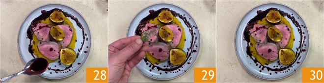Adicione os figos e o molho de Porto 28, finalize com um pouco de alecrim 29. Seu filé com abóbora e figos está pronto para ser servido 30.