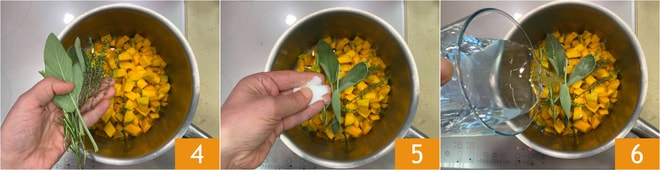Em uma panela, coloque um fio de azeite e adicione a abóbora. Junte o alecrim e a sálvia 4, ajuste o sal 5. Cubra com água 6 e cozinhe por 15-20 minutos, até que a abóbora esteja macia.
