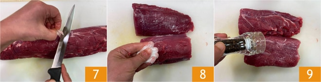 Enquanto isso, limpe o filé de excesso de gordura 7, corte-o ao meio e tempere com sal 8 e pimenta 9.