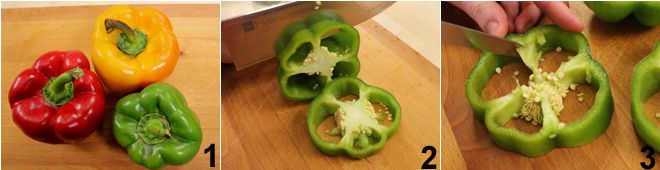 Para preparar as flores de pimentão com ovos, comece lavando bem os pimentões: escolha pimentões que não tenham uma circunferência reta e regular, mas sim “recortada” 1, ao cortá-los em fatias eles devem ter a forma de uma flor. Corte-os em fatias com cerca de 2 cm de espessura com uma faca afiada 2 e elimine a parte central das fatias 3.