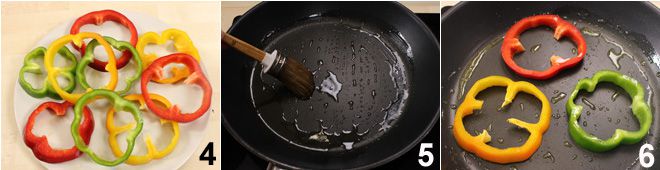 Proceda da mesma forma com os pimentões vermelhos, amarelos e verdes. Pincele uma frigideira antiaderente com um pouco de azeite de oliva extravirgem 5 e quando estiver bem quente coloque as rodelas de pimentão 6, deixe-as dourar por alguns segundos de um lado e depois vire-as do outro lado.