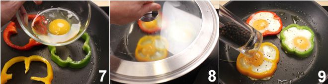 Quebre um ovo em um pequeno recipiente, tomando cuidado para não quebrar a gema e depois, sempre com muita delicadeza, despeje-o dentro da rodela de pimentão 7. Proceda assim também com os outros ovos. Neste ponto, cubra com uma tampa 8 e deixe cozinhar os ovos em fogo médio, desligando o fogo quando o ovo atingir o grau de cozimento desejado por você.