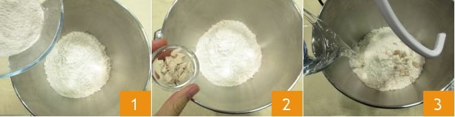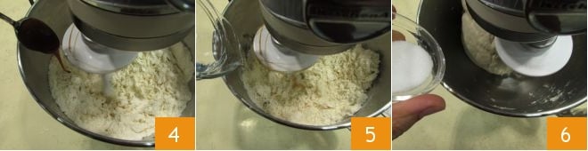 Ligue a batedeira em baixa velocidade e adicione também o malte (alternativamente, você pode usar uma colher de chá de açúcar). Adicione aos poucos a água restante 5 e o sal 6