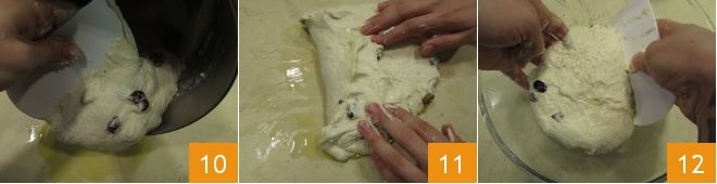 despeje a massa aqui com a ajuda de uma espátula 10, a massa estará bastante hidratada. Agora faça algumas dobras na massa, juntando as bordas para o centro 11, formando uma esfera; então coloque-a dentro de uma tigela 12.
