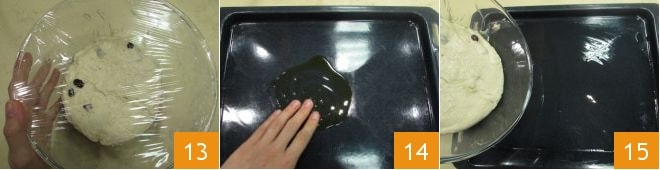 Cubra com filme plástico 13 e deixe a massa crescer por uma hora no forno desligado com a luz acesa. Após esse tempo, unte uma assadeira com azeite de oliva (retirado da dose para temperar)14, então despeje a massa na assadeira 15