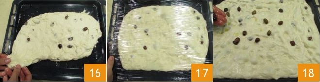 e estique com a ponta dos dedos para distribuí-la uniformemente na assadeira 16. Cubra a assadeira com filme plástico 17 e deixe crescer por mais uma hora no forno desligado com a luz acesa. Após o tempo de crescimento, recheie a focaccia com as azeitonas taggiasche escorridas 18
