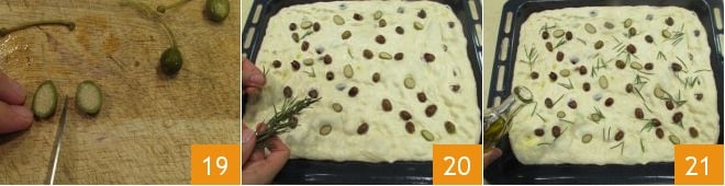 Corte ao meio os frutos das alcaparras 19 e distribua-os também na superfície da focaccia, aromatize com as folhas de alecrim 20 e tempere com o azeite de oliva restante 21.