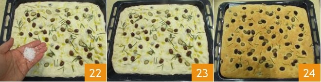 Para finalizar, distribua por cima também os flocos de sal 22. A focaccia está pronta para ir ao forno 23: asse em forno estático pré-aquecido a 200°C por 30-35 minutos, tendo o cuidado de colocar dentro do forno uma panela cheia de água quente que garantirá o nível adequado de umidade durante o cozimento. Após o tempo de cozimento, retire a focaccia com alcaparras, alecrim e azeitonas taggiasche do forno 24, deixe esfriar um pouco e depois sirva!