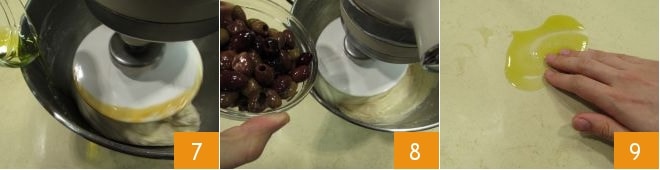 e depois também o azeite de oliva aos poucos 7, amasse por 10-15 minutos até que a massa esteja bem ligada ao gancho, nesse ponto adicione também metade das azeitonas taggiasche escorridas do óleo de conservação 8 e misture por mais 10 segundos com a batedeira, o tempo necessário para incorporar as azeitonas. Desligue a batedeira, unte levemente uma superfície de trabalho 9,