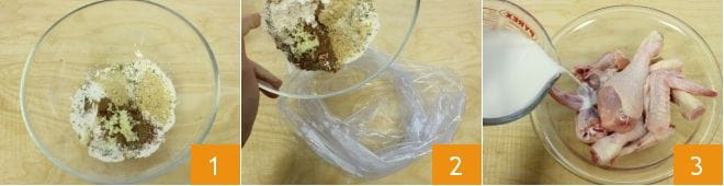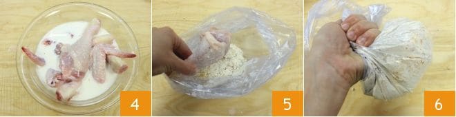 Gire os pedaços de frango para que fiquem bem umedecidos 4, depois coloque-os no saco plástico junto com as especiarias 5, feche bem o saco com uma mão e agite para temperar os pedaços de frango, que devem ficar bem enfarinhados 6. Deixe o frango descansar por alguns minutos.