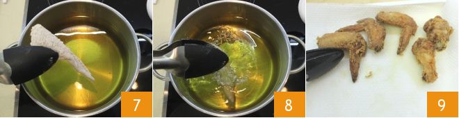 Enquanto isso, coloque no fogo uma panela com o óleo de sementes, aqueça o óleo, a temperatura ideal é de cerca de 170º-180º, se não tiver um termômetro, mergulhe uma pitada de farinha de rosca no óleo e, se ferver, está pronto para fritar. Os pedaços de frango devem ficar bem imersos no óleo 7, cozinhe o frango por 10 minutos de cada lado. Quando estiver cozido, retire o frango com uma pinça de cozinha 8 e coloque-o em uma bandeja forrada com papel absorvente para que perca o excesso de óleo 9. Seu frango frito americano está pronto para ser degustado!