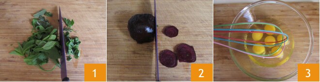 Para preparar a omelete de beterrabas, primeiro lave e depois pique a hortelã e a salsa 1. Corte a beterraba pré-cozida em fatias finas 2. Bata os ovos com um batedor 3.