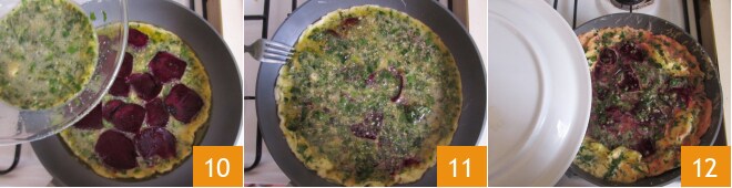 vire a omelete com um movimento rápido e firme 13. Continue cozinhando 14 o outro lado por mais 5 minutos ou até que a omelete esteja completamente cozida. Sirva a omelete de beterrabas bem quente 15.