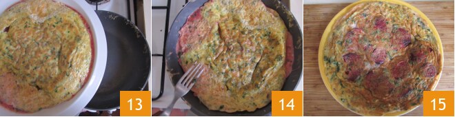 Cubra com o restante da mistura 10 e cozinhe por mais 5 minutos ou até que a base da omelete esteja firme o suficiente. Neste ponto 11, coloque um prato ou uma tampa do mesmo diâmetro sobre 12,
