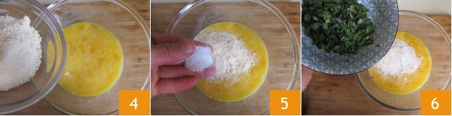 Tempere com o queijo ralado 4, uma pitada de sal 5 e adicione também a mistura de ervas aromáticas 6.
