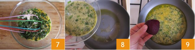 Misture novamente para combinar tudo 7. Em uma frigideira de cerca de 22 cm de diâmetro, despeje um fio de óleo, espalhe-o o mais uniformemente possível e aqueça. Em seguida, adicione cerca de metade da mistura 8. Cozinhe por 5 minutos ou até que os ovos estejam ligeiramente firmes. Coloque as fatias de beterraba 9.