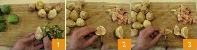Para preparar a geleia de figos e amêndoas, a primeira coisa a fazer é descascar os figos 1: de um kg, você obterá cerca de 800 gramas. Nesse ponto, corte-os em quatro partes 2 e depois divida cada pedaço ao meio 3.