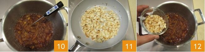 até alcançar a temperatura de 105° 10; sempre use um termômetro de cozinha para medir a temperatura correta. Ao contrário de outras geleias, esta não deve atingir a temperatura usual de 108°, caso contrário, com os figos, ficará muito densa e pegajosa. Enquanto a geleia atinge a temperatura, toste também as amêndoas em uma frigideira, em fogo moderado 11. Quando estiverem bem douradas, desligue o fogo e adicione-as à sua geleia 12.