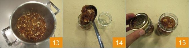 Misture para incorporá-las ao restante 13 e então ocupe-se de envasar a geleia de figos e amêndoas, ela deve estar ainda quente 14 e você deve deixar pelo menos 1 cm de espaço da tampa; se o espaço deixado for maior, não há problema, desde que o vácuo se forme sem problemas. Caso contrário, você pode usar potes menores, sempre deixando pelo menos 1 cm da borda. Aperte bem as tampas sanitizadas, mas não de forma excessiva 15 e deixe esfriar. Com o calor da geleia, o vácuo se formará, permitindo conservar o produto por um longo tempo. Uma vez que os potes estejam frios, verifique se o vácuo ocorreu corretamente: você pode pressionar o centro da tampa e, se não ouvir o clássico "click-clack", o vácuo ocorreu. Sua geleia de figos e amêndoas estará pronta para ser saboreada!