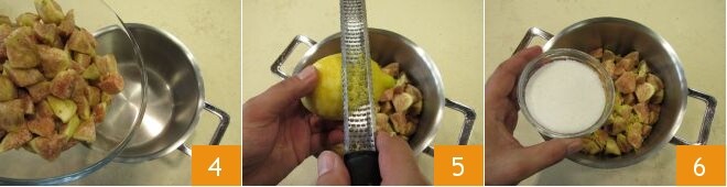 Transfira os figos para uma panela, de preferência com fundo grosso 4, adicione a casca de limão 5, o açúcar 6
