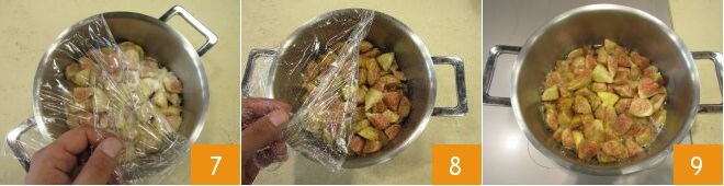 misture brevemente de forma bem delicada e cubra com filme plástico 7. Deixe os figos macerarem por 1 hora e, enquanto isso, ocupe-se de sanitizar os potes onde você armazenará sua geleia de figos e amêndoas; recomendamos seguir as diretrizes do Ministério da Saúde indicadas no final da receita. Após este tempo, remova o filme plástico 8 e leve ao fogo. Use uma chama alta até a fervura, depois continue cozinhando em fogo baixo, mexendo de vez em quando,