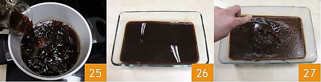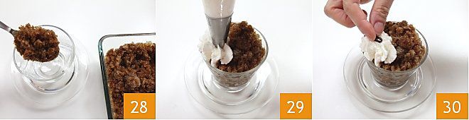 Adicione então o café recém-preparado 10 e transfira a mistura para um recipiente baixo e largo 11 para acelerar o congelamento. Deixe esfriar, remova a fava de baunilha e cubra o recipiente com uma camada de filme plástico. Coloque no freezer por pelo menos 15-20 minutos. Quando a mistura estiver solidificada, quebre os cristais de gelo com os dentes de um garfo ou com um batedor a cada 10-15 minutos, repetindo a operação por 2-3 vezes 12. Cada vez o tempo diminuirá, pois a preparação já está fria e, portanto, levará menos tempo para solidificar a mistura. Esta operação deve ser feita delicadamente para não alterar a cor da granita. De fato, se absorver muito ar, corre o risco de ficar bege em vez de marrom escuro. Enquanto isso, bata o creme de leite fresco e o açúcar de confeiteiro com uma batedeira elétrica para decorar a granita.