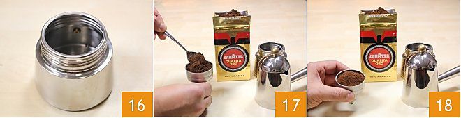 Para preparar a granita de café, comece fazendo o café. Para obter um ótimo café, encha a caldeira da cafeteira com água fria e, de preferência, pobre em calcário, tomando cuidado para não ultrapassar a válvula de segurança 1 (caso contrário, o café ficará mais longo). Encha o filtro com café moído formando uma montanha que você nivelará batendo o filtro na mesa com movimentos firmes 2. Não pressione com a colher, nem faça furos na superfície 3.