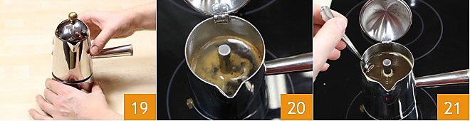 Feche a cafeteira bem apertada 4, para que o café não vaze pelos lados enquanto sobe, e coloque-a em uma chama baixa e constante para obter um café encorpado. À medida que o café sobe, se formará uma espuma densa 5: recomendamos que não deixe o café borbulhar por muito tempo para manter sua doçura e aroma intactos. Seu café está pronto: antes de usá-lo, misture diretamente na moka com uma colher para deixar o café mais homogêneo 6.