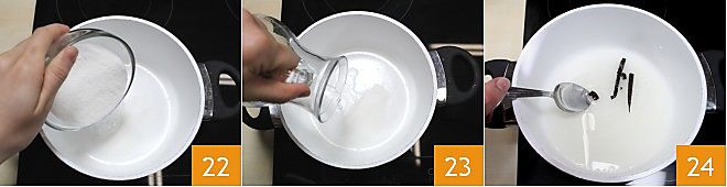 Cuidamos agora da preparação da granita: em uma panela antiaderente, coloque o açúcar 7 e adicione a água 8. Depois de cortar ao meio uma fava de baunilha, esvazie-a e junte à água e ao açúcar com suas sementes 9 e leve para ferver.