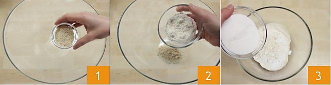 Para preparar as mini madeleines, comece colocando em uma tigela a farinha de amêndoas 1. Adicione a farinha de trigo peneirada 2 e o açúcar 3.