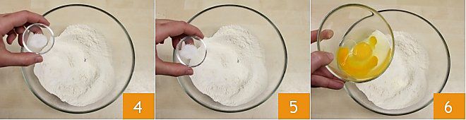 Adicione também o sal 4, o fermento peneirado 5 e os ovos 6.