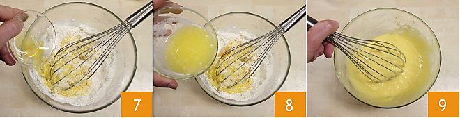 Continue adicionando o mel 7 e a manteiga derretida previamente 8, depois misture bem com um batedor manual 9.