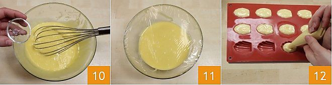 Por último adicione o aroma de amêndoa 10. Cubra a massa com filme plástico e deixe descansar na geladeira por pelo menos duas horas ou, se possível, durante a noite toda 11. Despeje a mistura em um saco de confeitar e depois pegue uma forma de silicone para mini madeleines, com as clássicas forminhas em forma de concha, e preencha todas as forminhas 12. Se você não tiver a forma de silicone, pode usar uma forma de metal e despejar a massa com uma colher.