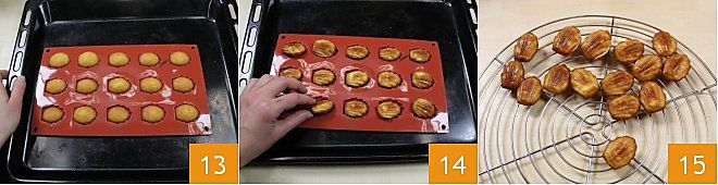 Transfira a forma para uma assadeira e asse em forno estático a 190° por cerca de 12 minutos, se usar um forno ventilado, asse a 170° por 6-7 minutos 13; se usar uma forma de metal, asse a 180° até que fiquem douradas. Quando estiverem mornas, desenforme cuidadosamente da forma 14 e deixe esfriar em uma grade 15. Conserve sob uma cúpula de vidro ou em um recipiente para que mantenham sua fragrância.