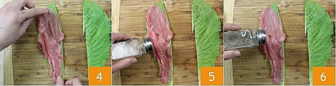 Agora coloque 2 fatias de carpaccio em cada metade da folha 4 e tempere com sal 5 e pimenta 6 a gosto.