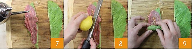 Despeje um fio de óleo sobre as fatias temperadas 7 e rale um pouco de casca de limão 8. Se desejar, pode espalhar um pouco de mostarda na fatia de carpaccio. Agora enrole a folha de alface recheada deixando o lado da abertura para baixo 9, para que os rolinhos não se desenrolem e desmanchem. Seus rolinhos frios de alface com carne estão prontos para serem saboreados! Lembre-se de conservar tudo na geladeira até o momento de servir.