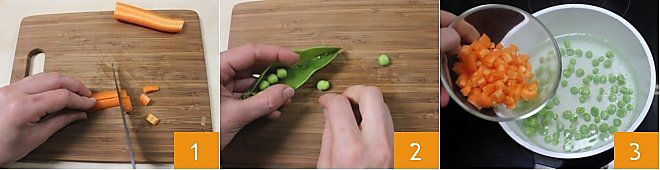 Para preparar os rolinhos frios de alface com legumes, comece descascando uma cenoura e cortando-a em cubos pequenos 1. Em seguida, descasque e lave as ervilhas 2 e ferva-as em uma panela com os cubos de cenoura por cerca de 10 minutos 3; se usar ervilhas já descascadas, precisará de cerca de 65 g. Uma vez cozidas, escorra-as e coloque-as em uma tigela.