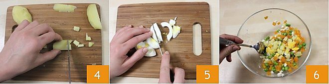 A parte, ferva um ovo em uma panela e cozinhe uma batata; quando a batata estiver cozida, descasque e corte em cubos 4 e quando o ovo estiver firme, retire a casca e divida ao meio, separando as gemas que você pode esfarelar na tigela; então corte as claras em pedaços 5 e adicione à tigela junto com os outros ingredientes: a batata, as ervilhas e as cenouras 6.