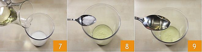 Agora prepare a Finta maionese senza uova: despeje o leite de soja e o óleo de girassol em um copo alto, pode ser o copo de plástico do mixer de imersão 7. Adicione o sal 8 e 1 colher de sopa de vinagre (ou suco de limão) 9.